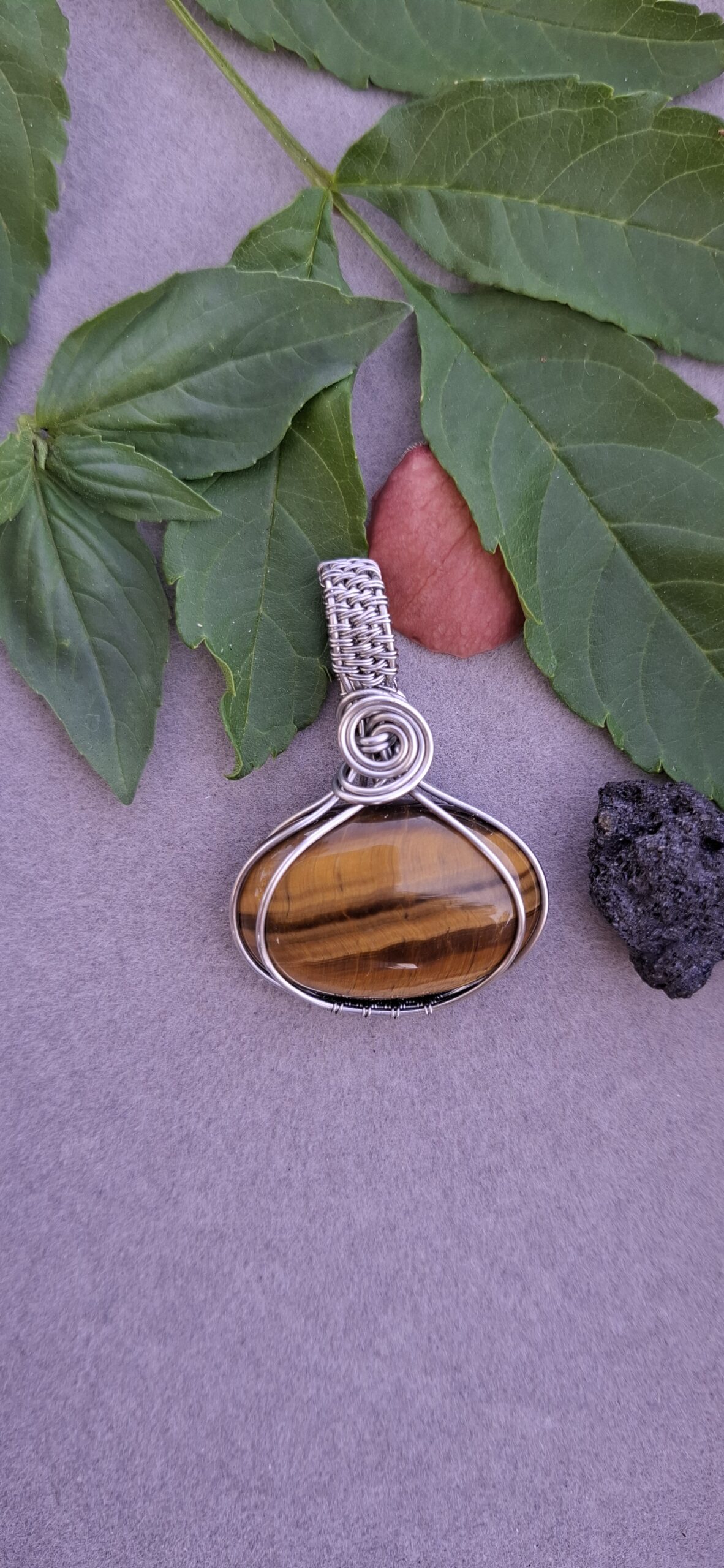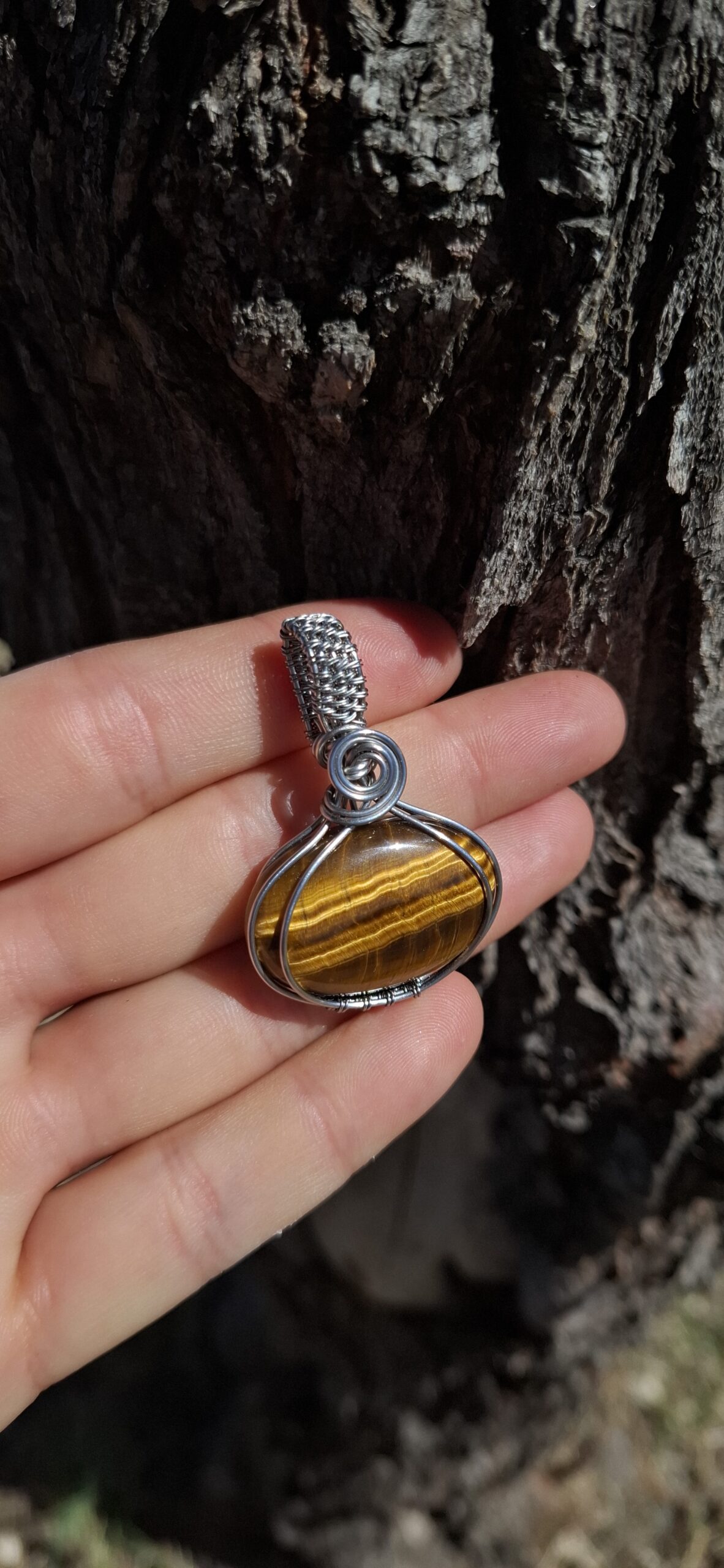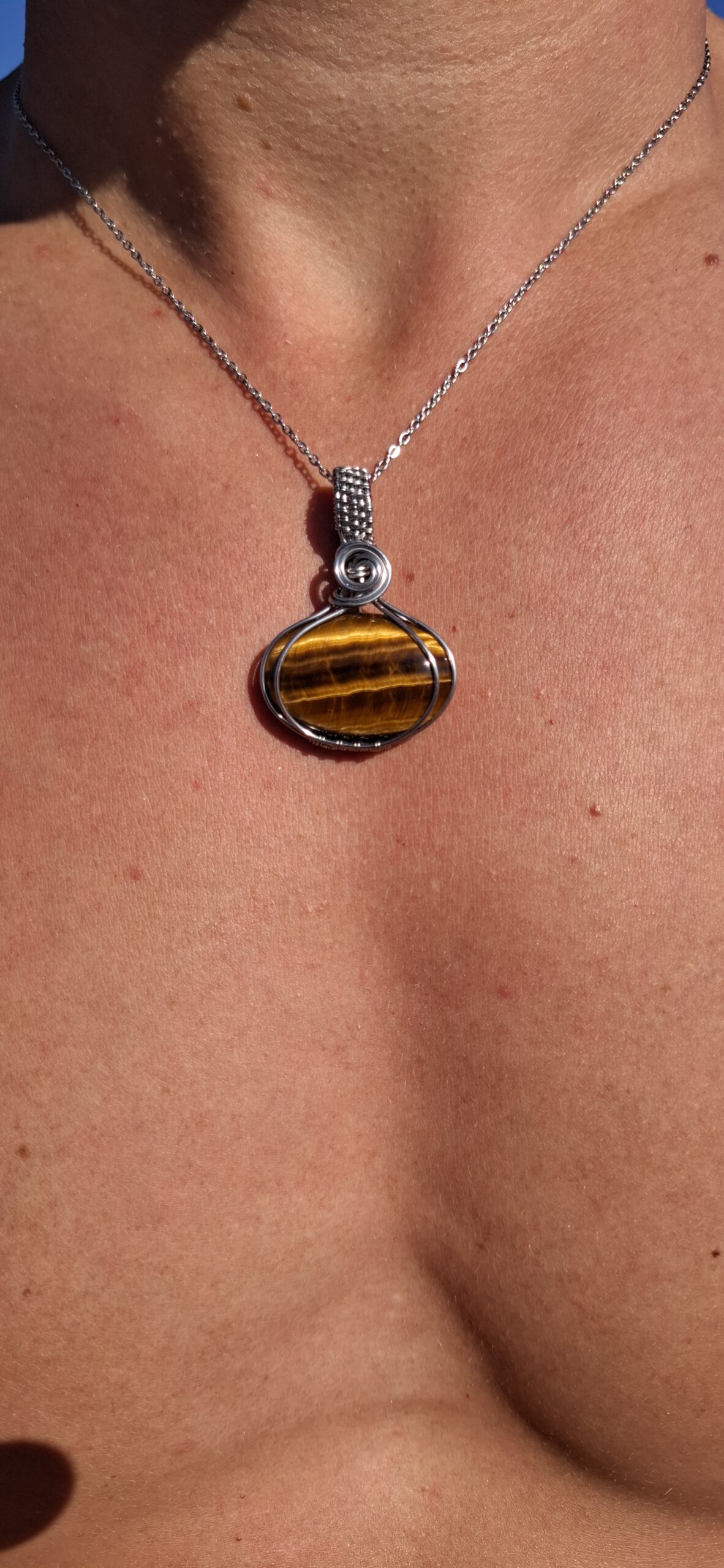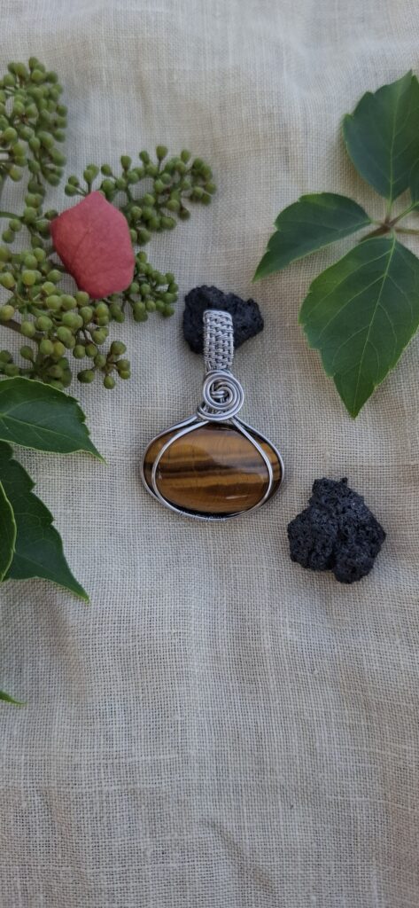 Dije Ojo de tigre engarzado en acero inoxidable.